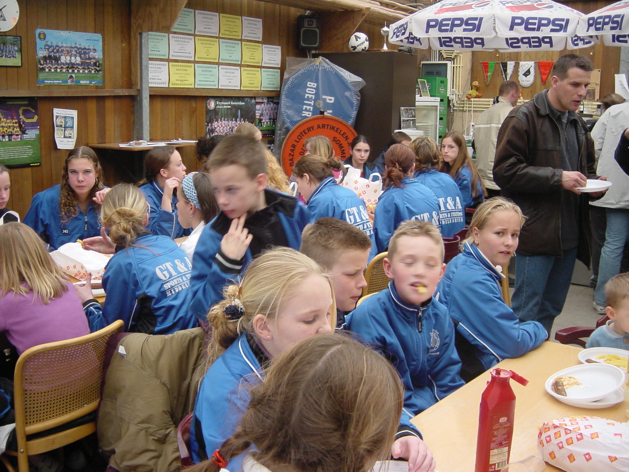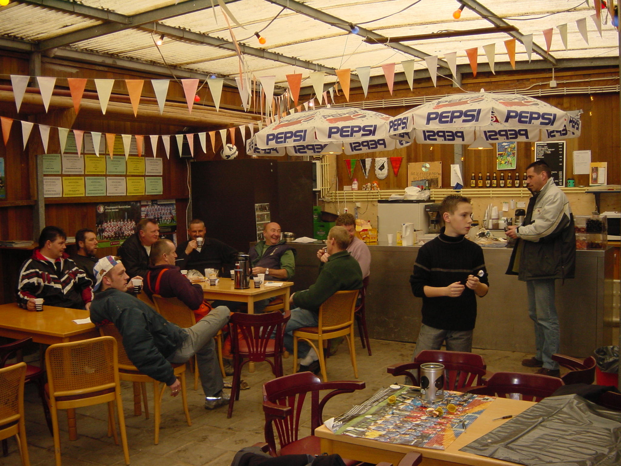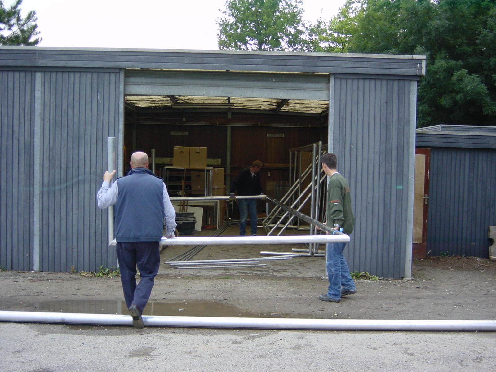Op weg naar het najaar van 2001 beleefden we koude maanden. Het was geen uitzondering dat in deze ‘kantine’ de derde helft plaatsvond waarbij alle gasten gekleed waren in dikke winterjassen, sjaals en mutsen. Heteluchtkanonnen werden geregeld om het nog enigszins behaaglijk te hebben. Dat het hier een eigenlijk een landbouwschuur betrof werd nog eens duidelijk toen we na hevige regenval vele centimeters water hadden in deze kantine. En wat te denken van het wegwaaien van een deel van de dakplaten na een flinke storm. Een ding was wel duidelijk: we moesten ons beraden over de aanschaf en bouw van een andere semipermanente huisvesting.