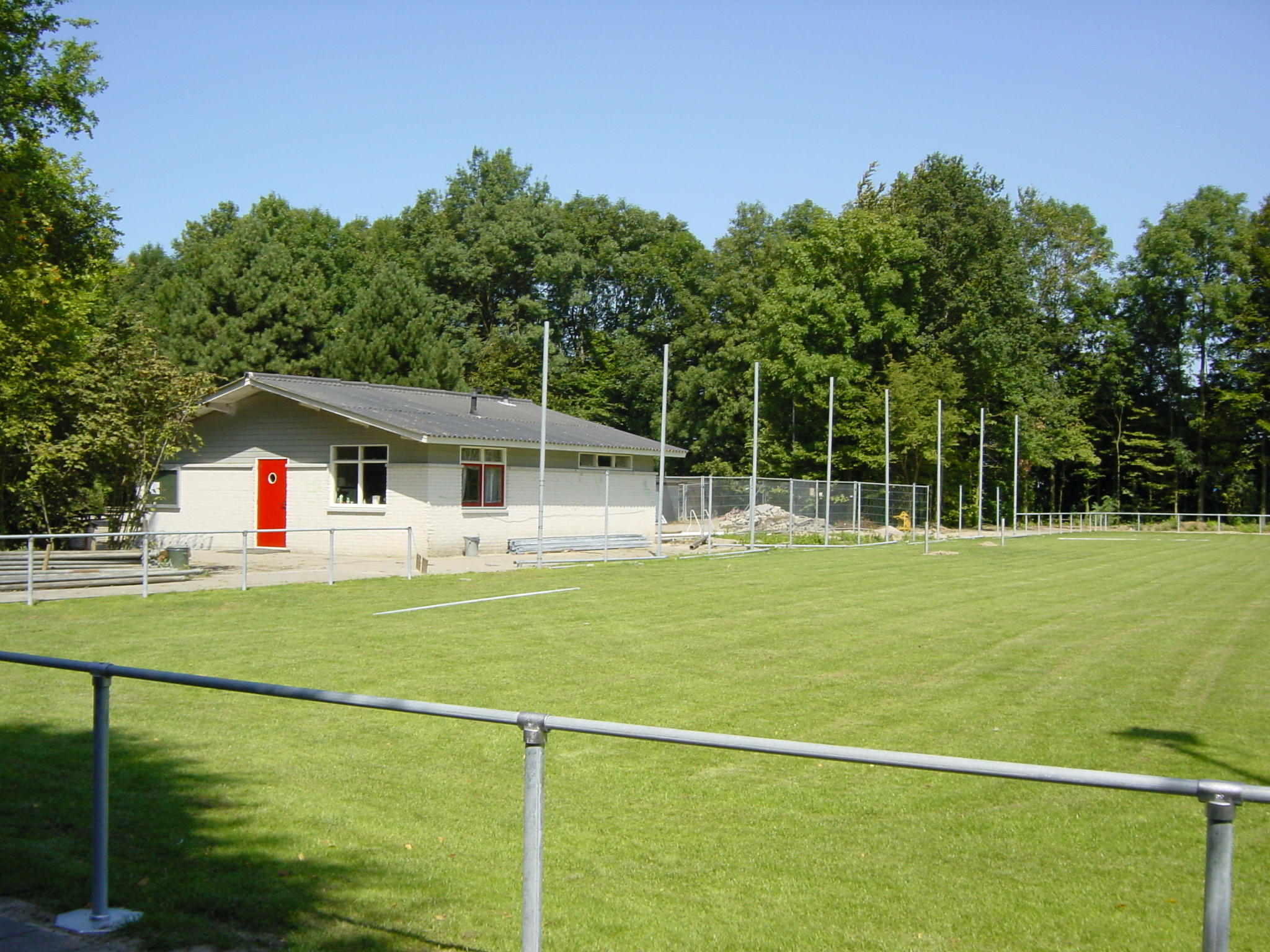 In de maanden daarna werd er hard gewerkt aan de opbouw van de vereniging. Vanuit verschillende hoeken werd er spontaan hulp geboden om te zorgen dat de accommodaties en speelvelden op tijd klaar zouden zijn voor het nieuwe seizoen. Om tijdens het eerste seizoen ook spelers en gasten goed te kunnen ontvangen werd een aanwezig loods omgebouwd tot kantine. Achter het rolluik van deze loods werd een heuse entree gebouwd, een bar geplaatst en de wanden werden gezet om toch een sfeervolle ruimte te creëren. Dat deze kantine uniek was bleek wel uit het feit dat in dezelfde ruimte ook tractoren en andere werktuigen gestald stonden. Al snel moesten hete luchtkanonnen en een extra jas voor aangename omstandigheden zorgen. Dat dit een tijdelijke situatie moest zijn werd al snel duidelijk. In het najaar en de winter van 2001/2002 kregen we te maken met lekkage, een stuk gewaaid dak en enorme wateroverlast. De reeds aanwezige “stenen” gebouwtje gaf ruimte voor kleedruimten, een keukentje dat tevens dienst deed als commissiekamer en vergaderkamer.