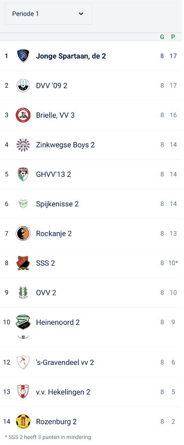 De Jonge Spartaan 2 heeft zaterdag 15 november de 1e periode titel verovert na een 3-2 winst op Heinenoord 2. Met een doelsaldo van +3 op de nummer 2 in de competitie DVV'09 wisten de Spartanen deze titel, in een zeer spannende en mooie competitie, te pakken in de 2e klasse H. De stand na 8 wedstrijden: |